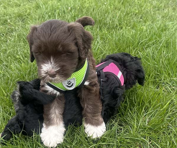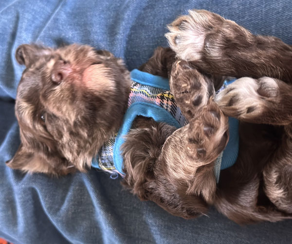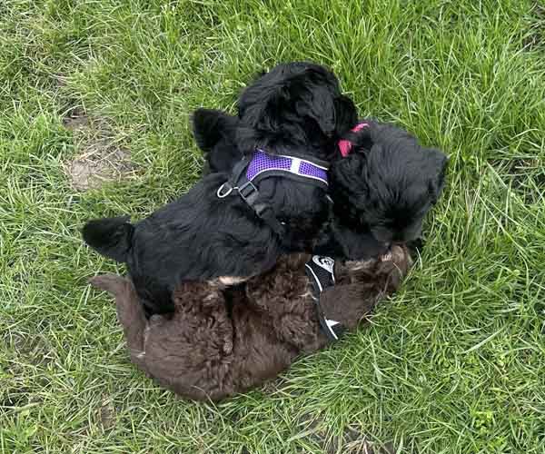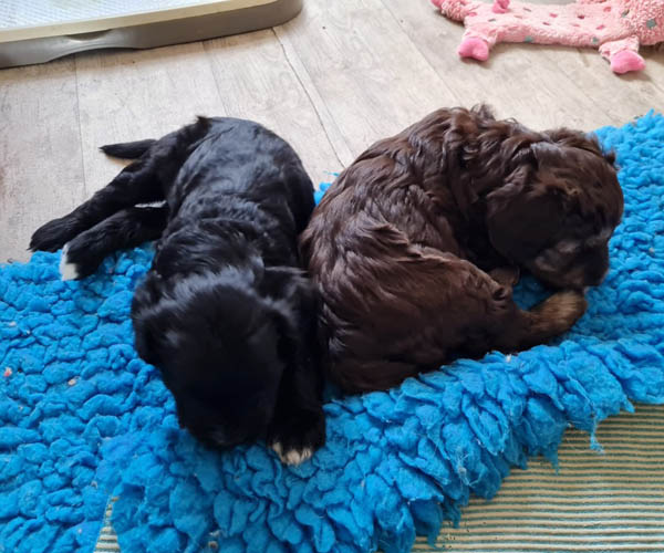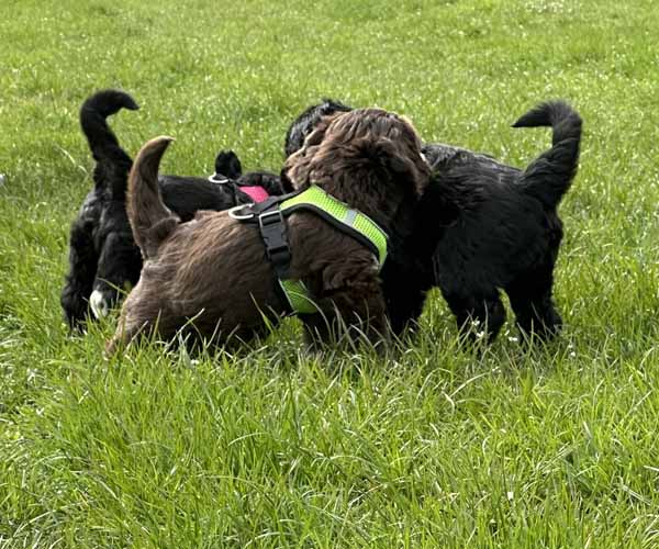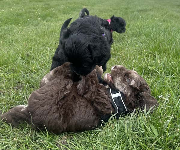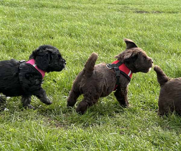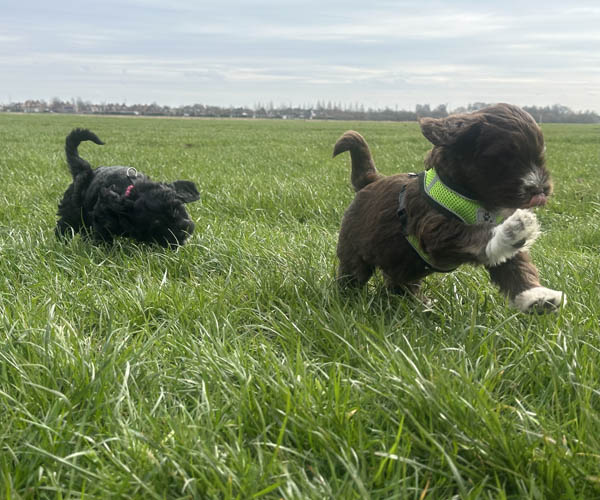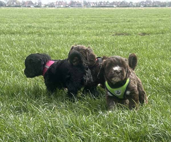 Onderling zijn ze elkaar volop aan het ontdekken: spelen, grenzen verkennen. Naar mensen toe zijn ze open en sociaal; ze komen graag naar je toe en zoeken actief contact. Ze wennen inmiddels ook aan tuigjes, de bench, korte momenten alleen in een aparte ruimte en maken al mooie stappen in hun zindelijkheidstraining op puppypads.