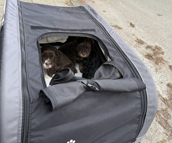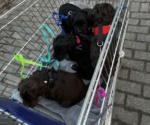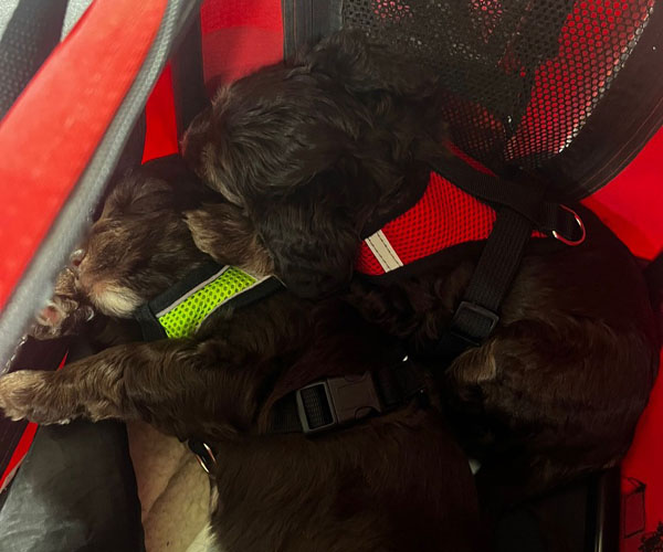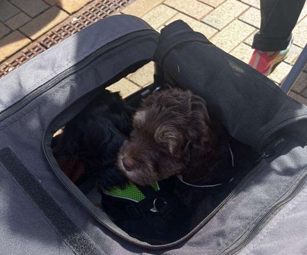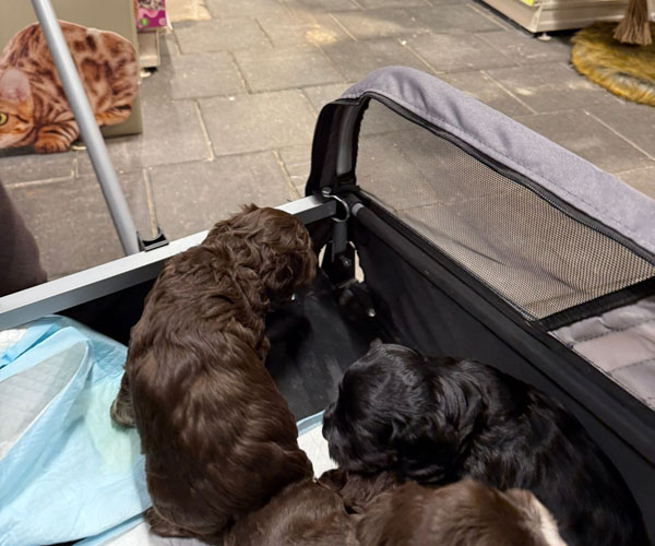 Ook zijn ze voor het eerst mee geweest in de hondenbuggy. Veilig samen op pad, de wereld ontdekken vanuit hun knusse plekje. En alsof dat nog niet genoeg was, hebben ze ook hun eerste uitstapje naar de dierenwinkel gemaakt. Nieuwe geurtjes, geluiden en indrukken... wat hebben ze het goed gedaan!