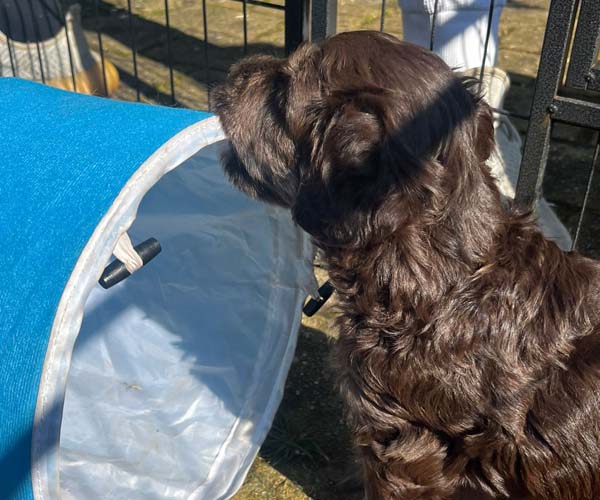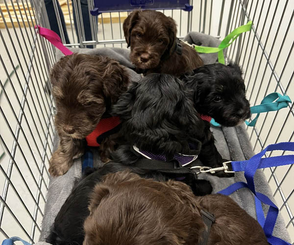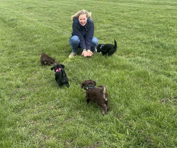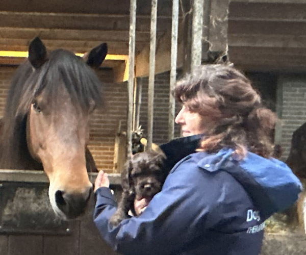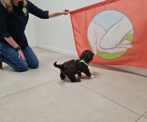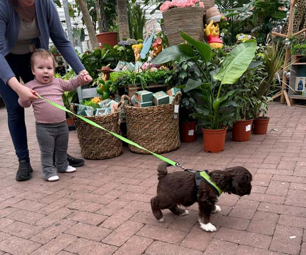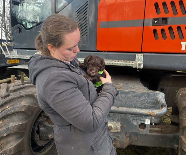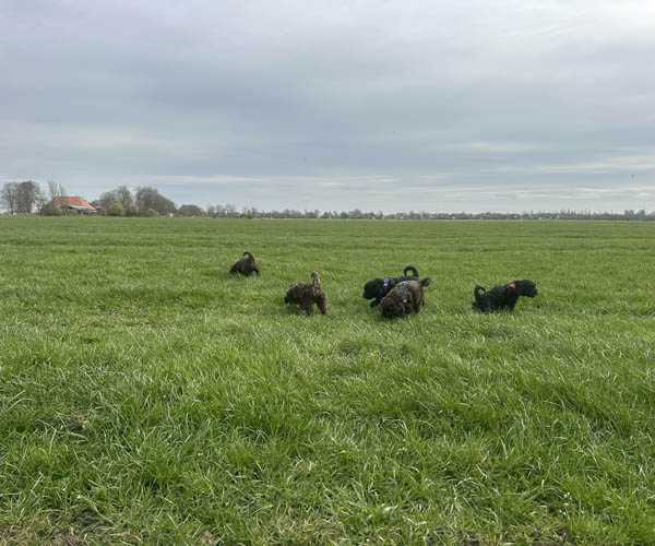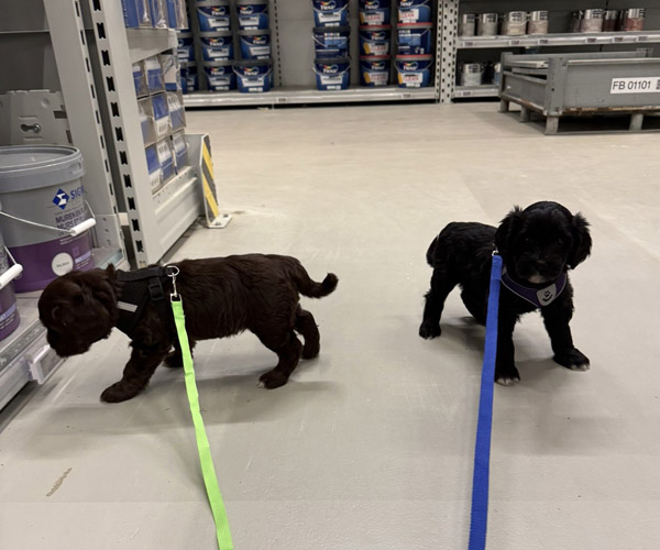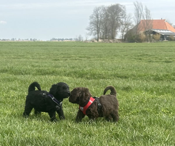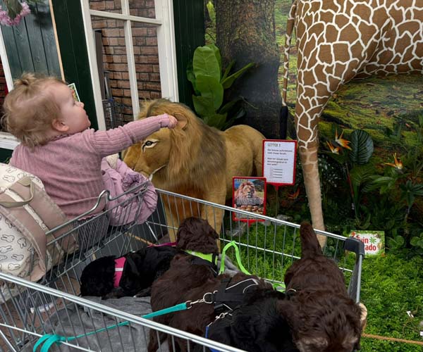 We hebben de pups bewust kennis laten maken met allerlei situaties, geluiden, mensen en omgevingen. In het begin samen met hun moeder Roxy, later ook zonder haar. Zo hebben ze geleerd om op een rustige en zelfverzekerde manier nieuwe ervaringen aan te gaan. Ook zijn ze individueel meegenomen, zodat ze al kunnen wennen aan het even alleen zijn en het opbouwen van een eigen band met mensen.