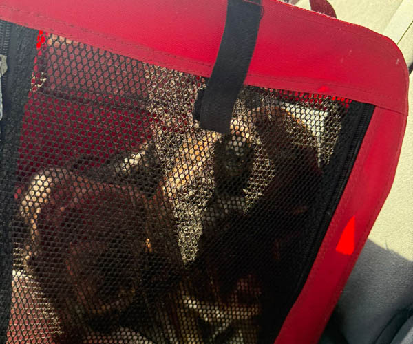Daarnaast zijn ze goed vertrouwd geraakt met de bench ( zowel de draadbench als de canvas bench) in huis én onderweg. ’s Nachts slapen ze inmiddels al ruim een week ontspannen in hun eigen bench. Dagelijkse verzorging, zoals borstelen, maakt onderdeel uit van hun routine en wordt door hen als prettig ervaren.