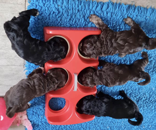 Ook tijdens het voeren besteden we aandacht aan hun ontwikkeling. Regelmatig eten de pups samen uit een trog. Dit stimuleert niet alleen het leren delen, maar helpt hen ook om meer voergericht te worden. Een voergerichte hond is namelijk vaak makkelijker trainbaar, wat voor de toekomstige eigenaren een fijne basis vormt bij het opvoeden en trainen.