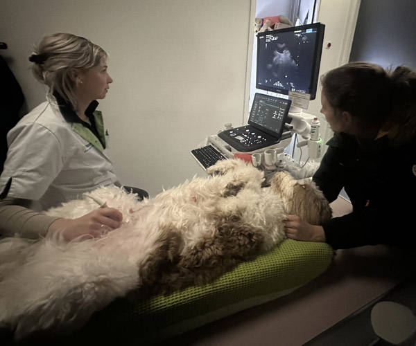 Amy gedroeg zich voorbeeldig bij de dierenarts. Eerst mocht een dierenarts in opleiding de echo doen zodat zij ervaring kon krijgen en daarna deed de dierenarts het nog een keer over. Amy bleef heerlijk rustig liggen en ze genoot van alle aandacht die ze kreeg.