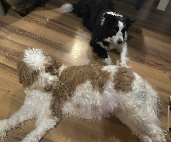 Onze Golden Doodle Amy heeft romantische dates gehad met onze Nizinny Guus en met onze Nizinny Twix. Amy kende Twix van een vorig nest en ze heeft met beide heren leuk gespeeld.