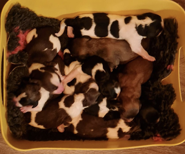 Om 19.37 uur kwam pup nummer negen ter wereld, een bruin/wit reutje, en om 20.48 uur werd pup nummer tien geboren: een zwart/wit reutje. We dachten dat Amy klaar was en gaven haar en de pups alle rust, de werpkist werd opgefrist en alles leek compleet…