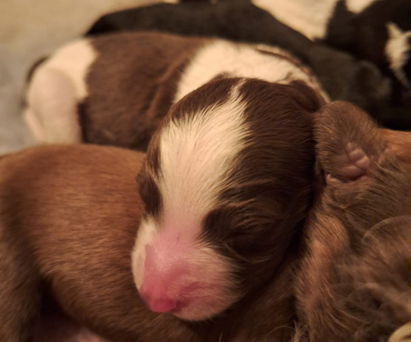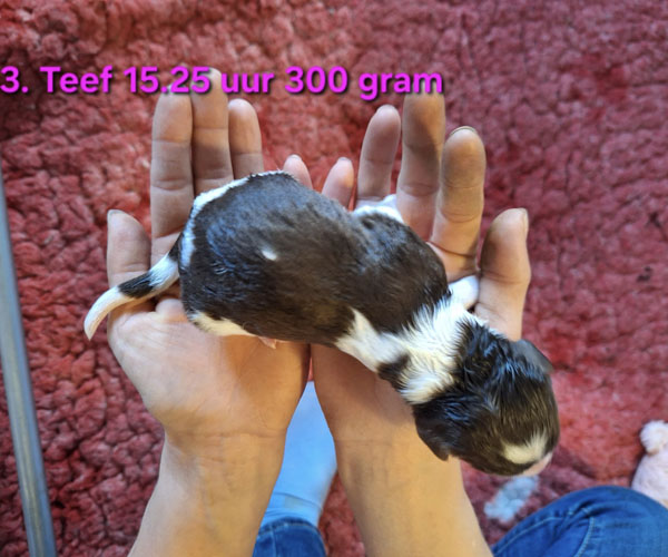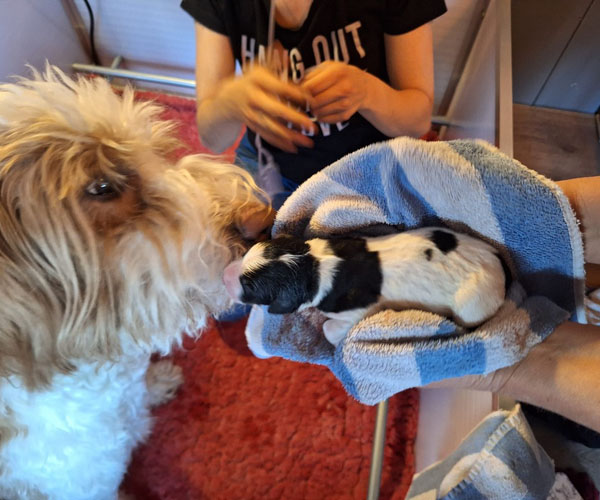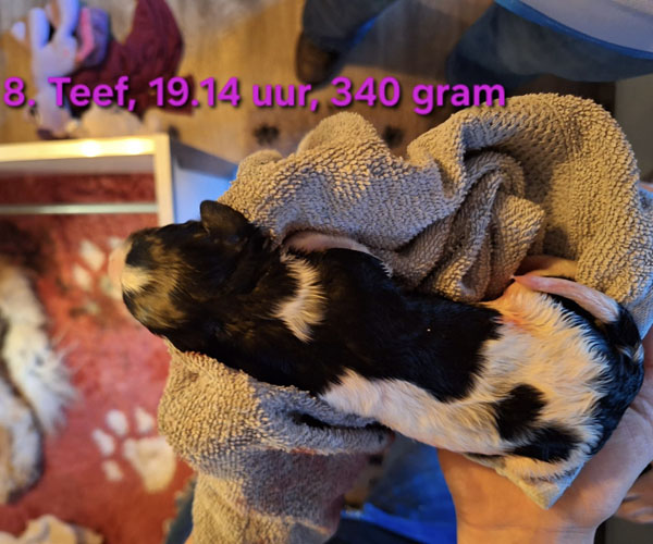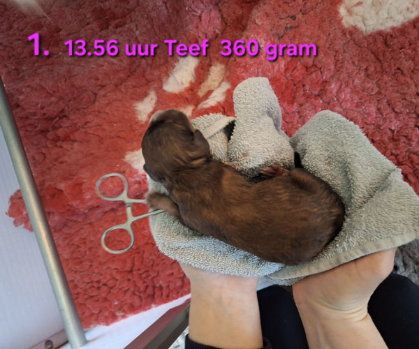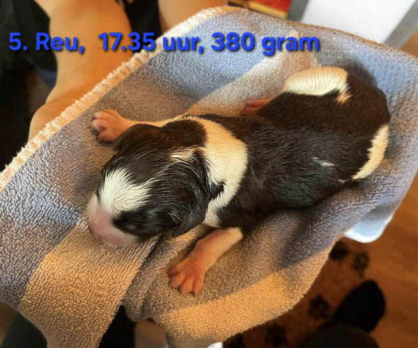 Om 13.56 uur werd het eerste pupje geboren: een prachtig bruin teefje. Daarna kwam het nest gestaag op gang. Om 14.50 uur volgde een bruin (wildkleur) reutje, en om 15.25 uur een zwart/wit teefje. Niet veel later, om 16.11 uur, werd pup nummer vier geboren: een zwart/wit reutje.
