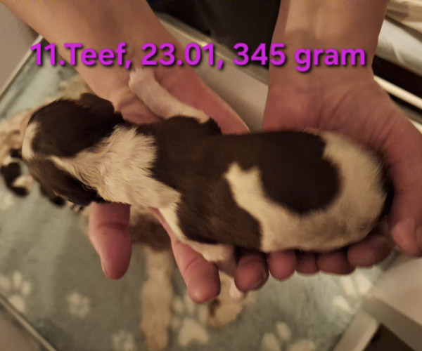 Tot onze grote verrassing diende zich om 23.01 uur nóg een wondertje aan: pup nummer elf, een bruin/wit teefje.