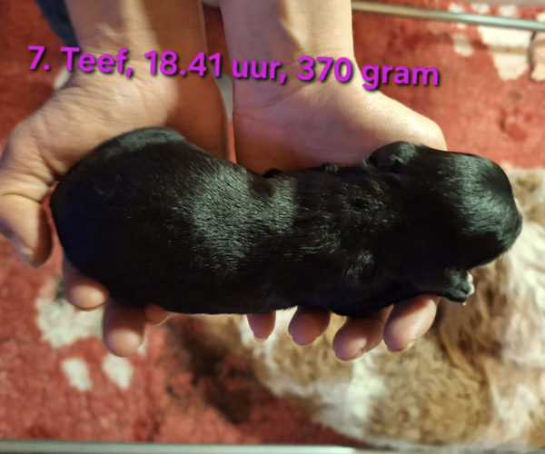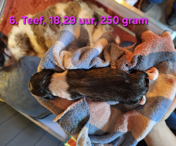 Amy nam daarna even een welverdiende pauze. Om 17.35 uur kwam pup nummer vijf, een bruin reutje, gevolgd door een bijzonder bruin/wit teefje met een schattig snorretje om 18.29 uur. Het tempo zat er weer in, want om 18.41 uur werd pup nummer zeven geboren: een zwart teefje. Slechts een half uur later, om 19.14 uur, volgde een zwart/wit teefje.