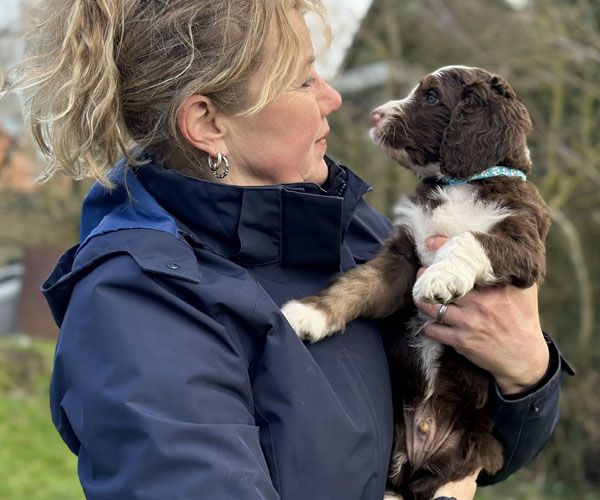 En dan is het zover… het Grote Vertrek. Na een uitgebreide uitleg over de eerste periode in hun nieuwe thuis, is het moment aangebroken: de PonDoodle puppen worden één voor één overhandigd aan hun nieuwe eigenaren. Wat een emotie, wat een blijdschap! Voordat iedereen vertrekt, laten we de puppen nog even uit en maken we een leuke groepsfoto van alle trotse eigenaren met hun nieuwe PonDoodle pup. Een feestelijk en dierbaar moment! Wat een bijzonder werk mogen wij toch doen. Al ons harde werk wordt beloond als we zien hoe vrij, mensgericht en stabiel de puppen de wereld instappen. Zeven gezinnen krijgen een Hond als Maatje. Deze honden zullen begeleid worden door oud-cursisten van de basisopleiding Therapiehondbegeleider, en sommige puppen krijgen eerst een interne opleiding.