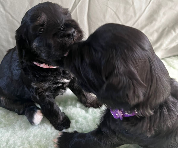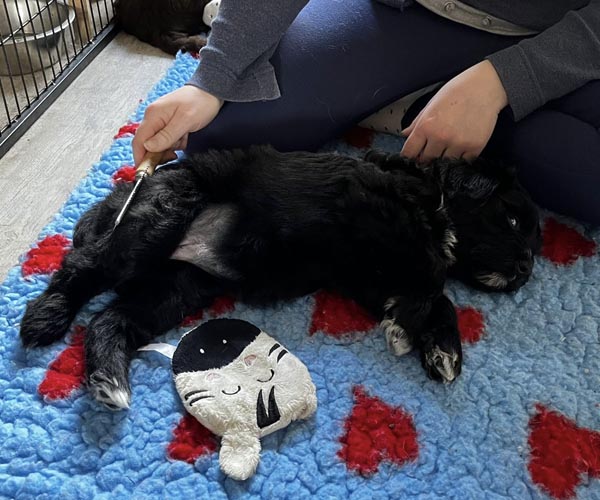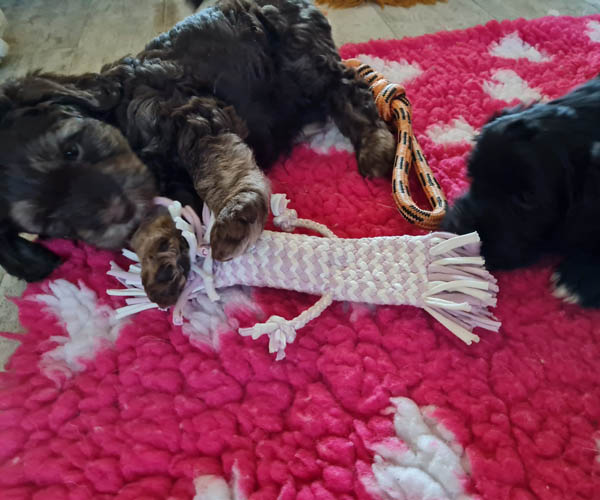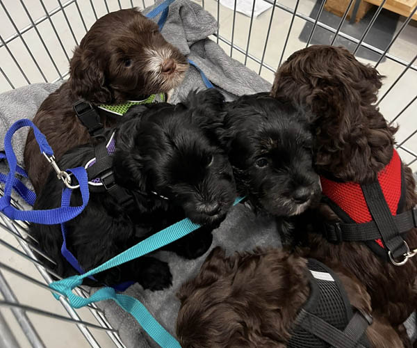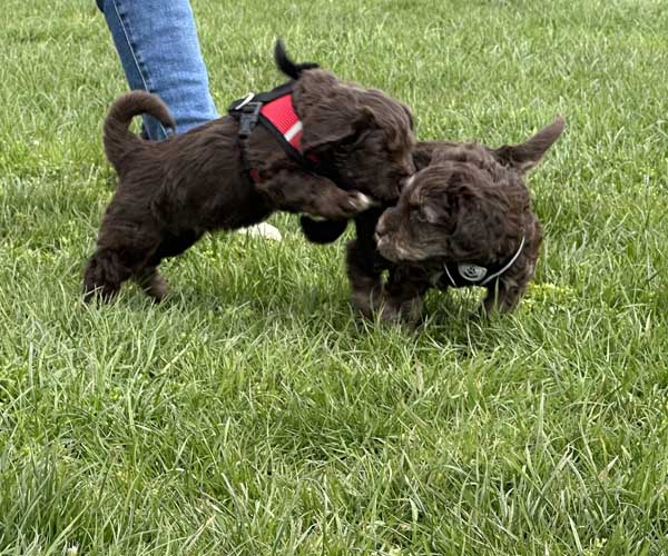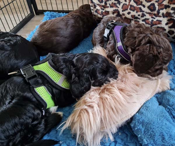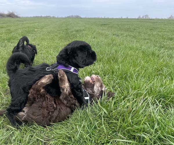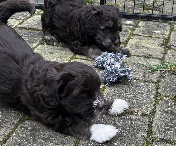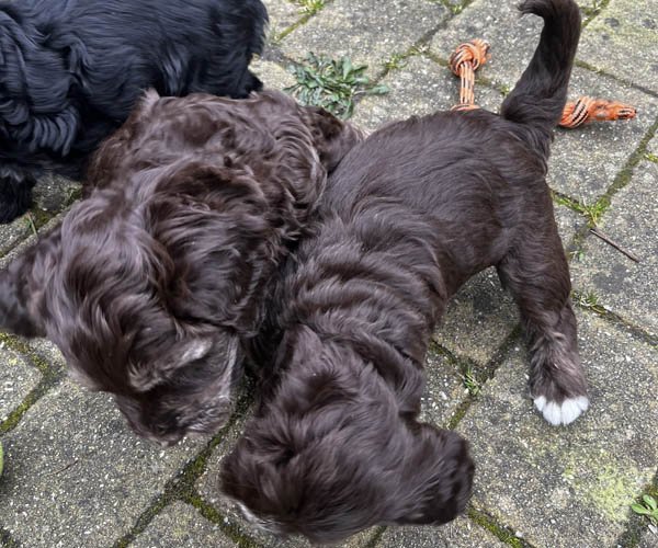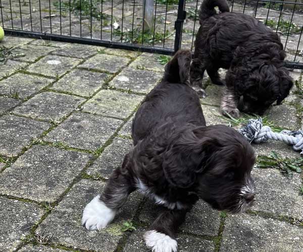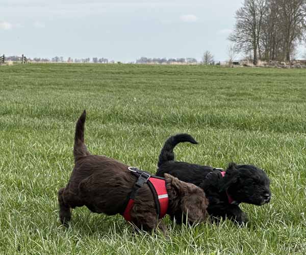 Onderling zijn ze elkaar volop aan het ontdekken: spelen, grenzen verkennen. Naar mensen toe zijn ze open en sociaal; ze komen graag naar je toe en zoeken actief contact. Ze wennen inmiddels ook aan tuigjes, de bench, korte momenten alleen in een aparte ruimte en maken al mooie stappen in hun zindelijkheidstraining op puppypads.