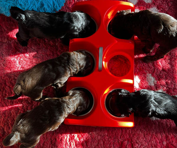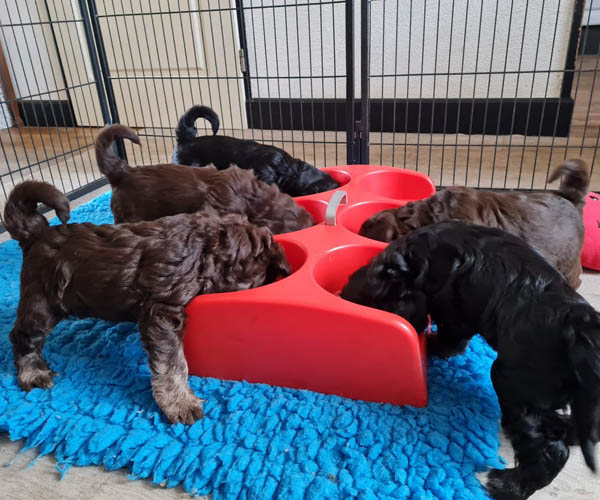 Ook tijdens het voeren besteden we aandacht aan hun ontwikkeling. Regelmatig eten de pups samen uit een trog. Dit stimuleert niet alleen het leren delen, maar helpt hen ook om meer voergericht te worden. Een voergerichte hond is namelijk vaak makkelijker trainbaar, wat voor de toekomstige eigenaren een fijne basis vormt bij het opvoeden en trainen.