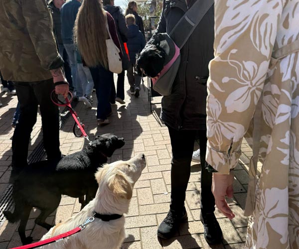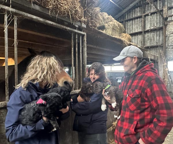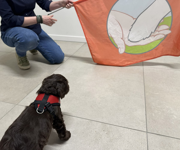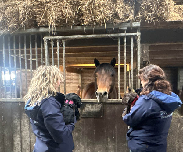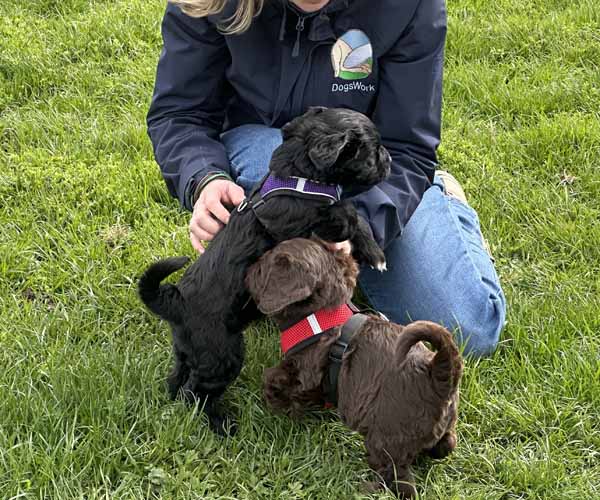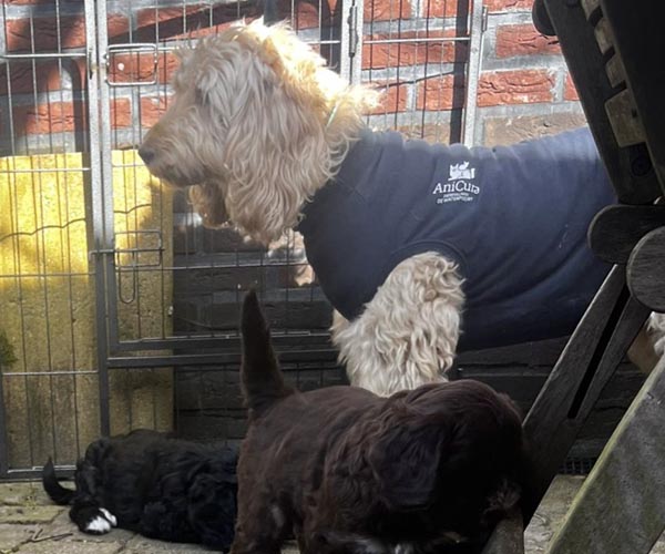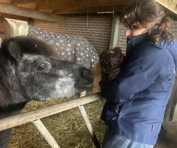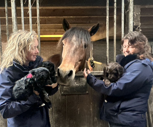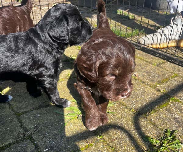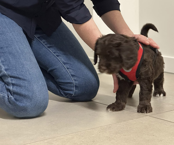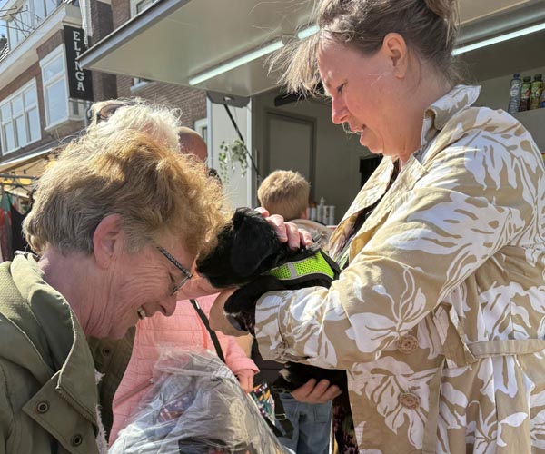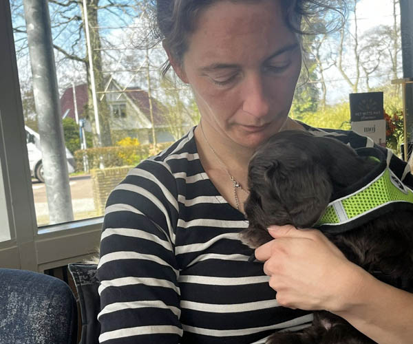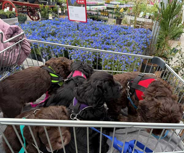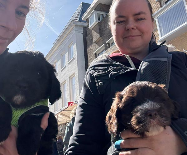 We hebben de pups bewust kennis laten maken met allerlei situaties, geluiden, mensen en omgevingen. In het begin samen met hun moeder Roxy, later ook zonder haar. Zo hebben ze geleerd om op een rustige en zelfverzekerde manier nieuwe ervaringen aan te gaan. Ook zijn ze individueel meegenomen, zodat ze al kunnen wennen aan het even alleen zijn en het opbouwen van een eigen band met mensen.