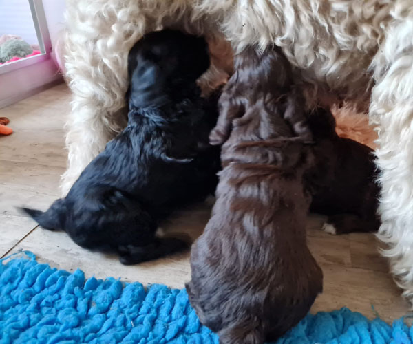 Vrijdag 20 februari: Golden Doodle Roxy is trotse moeder geworden van vijf prachtige pups. De geboorte van de puppen was nog wat vroeger dan we hadden verwadht maar verliep erg soepel. We zijn ontzettend blij met hun komst en genieten volop van deze bijzondere tijd. Roxy is een volleerde en een zorgzame en ontspannen moeder, en het is mooi om te zien hoe liefdevol zij haar pups begeleidt in hun eerste dagen. De pups groeien goed en ontwikkelen zich voorspoedig. De komende weken staan in het teken van rust, warmte en een fijne start in het leven.