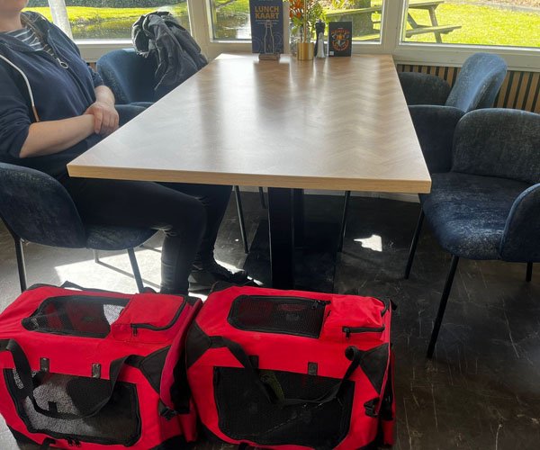 Daarnaast zijn ze goed vertrouwd geraakt met de bench ( zowel de draadbench als de canvas bench) in huis én onderweg. ’s Nachts slapen ze inmiddels al ruim een week ontspannen in hun eigen bench. Dagelijkse verzorging, zoals borstelen, maakt onderdeel uit van hun routine en wordt door hen als prettig ervaren.
