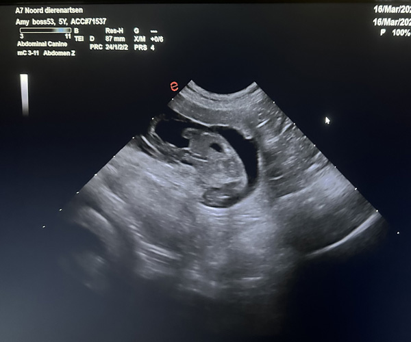 Dinsdag 17 maart: Met heel veel blijdschap delen wij dat onze lieve Amy drachtig is; de echo heeft het bevestigd!