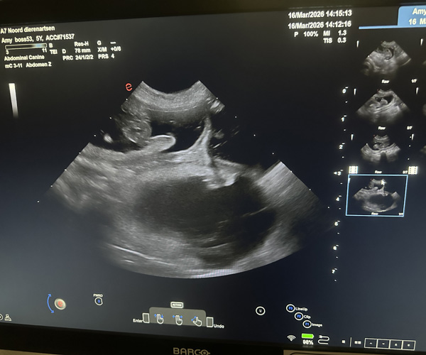 Amy gedroeg zich voorbeeldig bij de dierenarts. Eerst mocht een dierenarts in opleiding de echo doen zodat zij ervaring kon krijgen en daarna deed de dierenarts het nog een keer over. Amy bleef heerlijk rustig liggen en ze genoot van alle aandacht die ze kreeg.