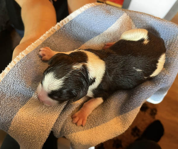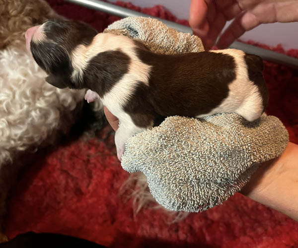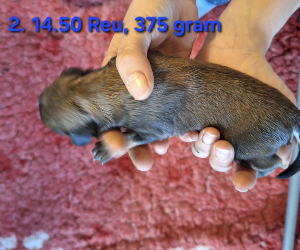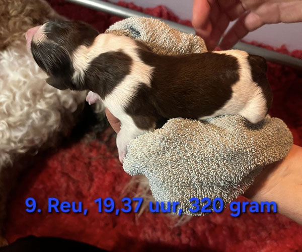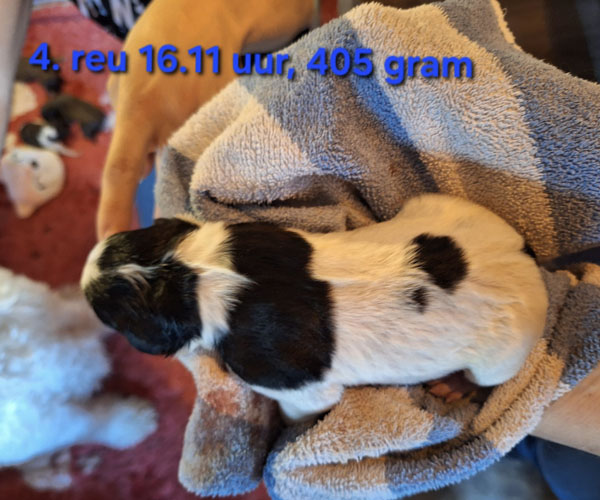 Om 13.56 uur werd het eerste pupje geboren: een prachtig bruin teefje. Daarna kwam het nest gestaag op gang. Om 14.50 uur volgde een bruin (wildkleur) reutje, en om 15.25 uur een zwart/wit teefje. Niet veel later, om 16.11 uur, werd pup nummer vier geboren: een zwart/wit reutje.