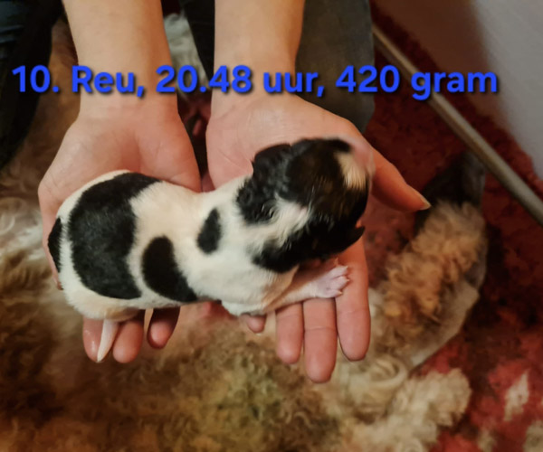 Om 19.37 uur kwam pup nummer negen ter wereld, een bruin/wit reutje, en om 20.48 uur werd pup nummer tien geboren: een zwart/wit reutje. We dachten dat Amy klaar was en gaven haar en de pups alle rust, de werpkist werd opgefrist en alles leek compleet…